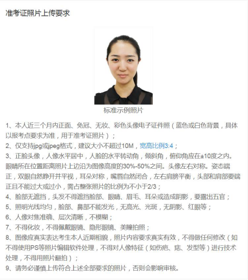 1.本人近三个月内正面、免冠、无妆、不戴眼镜、彩色电子证件照(白色背景,用于准考证照片)。照片要求见下图: