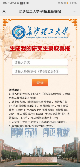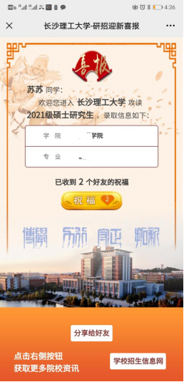 扫描下方二维码,生成你的专属喜报,将喜报转发至朋友圈邀好友集赞,在2021年9月6日前集点赞数,点赞数排名前120名的,学校将为你准备精美礼品一份!