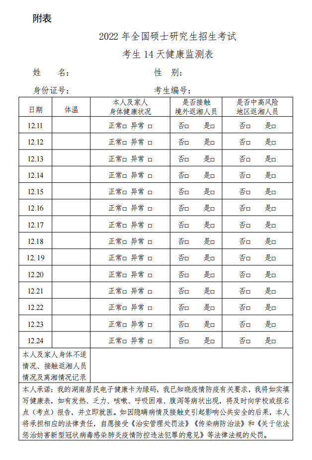 2.考生须在本人参加考试前14天(2021年12月11日,下同)连续进行自我体温监测,自行打印《2022年全国硕士研究生招生考试考生14天健康监测表》(以下简称“考生健康表”,见附件)后,如实填写并签名。如隐瞒或提供虚假信息,将按照有关规定追究相关责任。