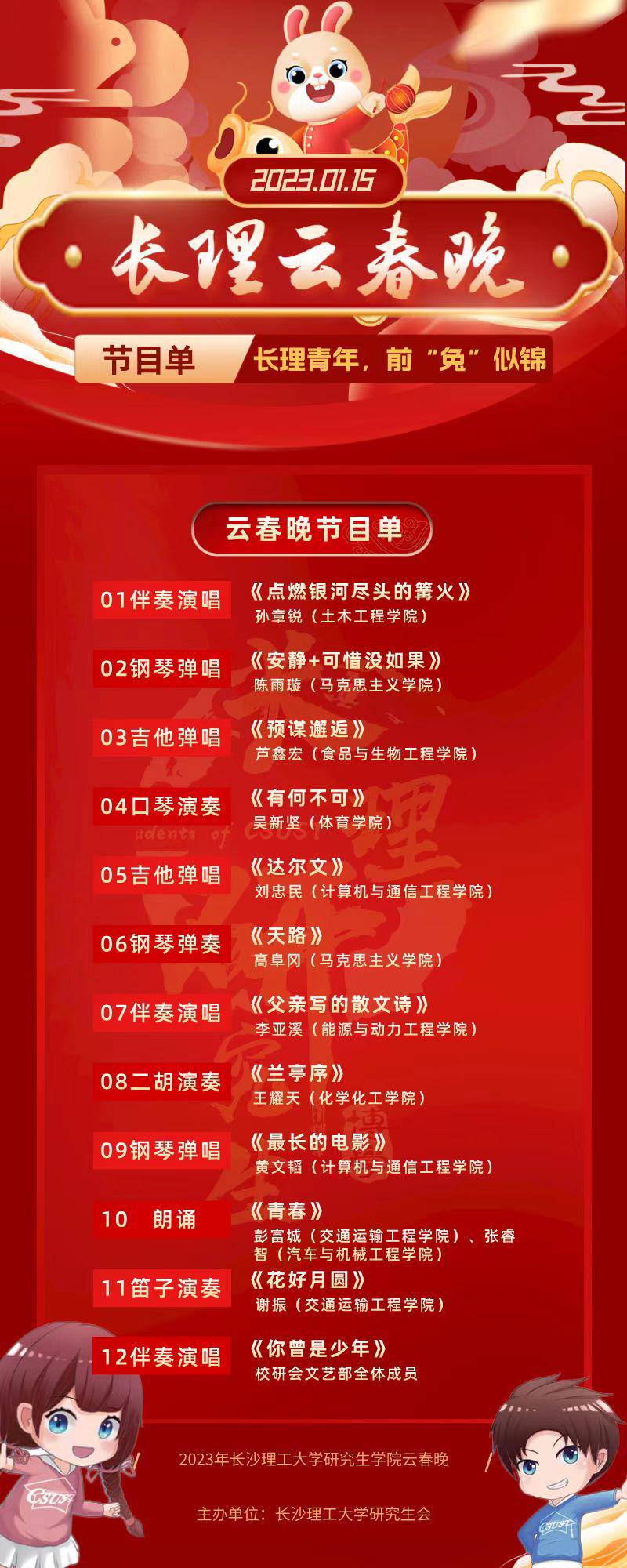 1月15日晚20点整,由校研究生会主办,文艺部和新媒体中心承办的第一届研究生2023年兔年“云春晚”在长理研言微信视频号举办。