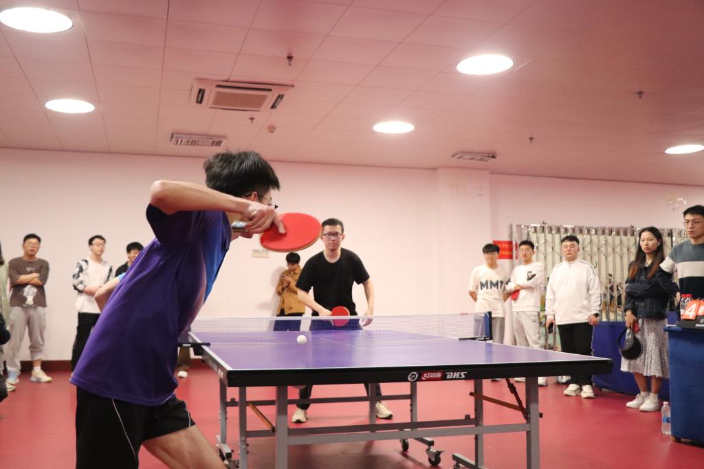 决赛现场,观众们掌声不断,加油助威的喝彩声回荡在乒羽中心。随着裁判员的举手示意,水利学院与经管学院之间的角逐正式开始。第一局男单比赛,经管学院张旭时而采用旋转球,时而采用扣球,引起现场阵阵欢呼。最终经管学院的张旭以11:4 11:3 11:5的比分战胜水利学院的吴天宇,为经管学院拿下了决赛首个项目的开门红。
