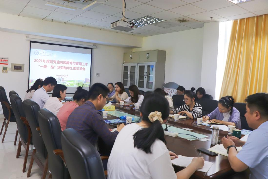 2021年以来,为落实学校第四次党代会精神,探索“双主体”协同发展新阶段研究生思政教育与管理的有效途径和方法,构建和完善“三全育人”新格局,研究生院(研工部)开展了研究生思政教育与管理工作“一院一品”项目创建工作。两年来,各学院结合自身学院专业特色,立足于解决实际问题与培育工作品牌相结合,按照项目实施方案,细化目标任务,落实工作举措,围绕职业发展类、思想引领类、队伍建设类等多个主题,培育了一批能展示学院特点、具有示范性和可持续性的研究生思政工作品牌。本次结项汇报交流会是对两年来建设成果的集中检视,也是提升学校研究生思政教育与管理工作水平的一次学习交流。