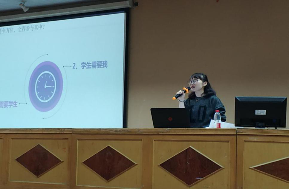 首先为大家做分享的是易亭亭老师,她曾荣获2013年湖南省社会实践优秀指导者,2017年研究生暑期专业实践优秀指导老师,她所带领的团队分别荣获校级二、三等奖。易老师站在辅导员角度向研究生们分享了她的心得,她主要讲述了研究生暑期专业实践与本科生暑期实践的区别,并分享了她作为指导老师,在暑期实践中的收获,及在实践中应该注意问题等。最后,易老师呼吁,研究生应该要有更崇高的理想与志向,脚踏实地,做一名有社会责任感的青年。
