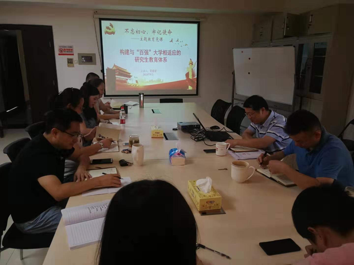 9月30日下午,研究生院支部召开全体党员会议,由研究生院支部书记、院长管德清主讲题目为《“构建与百强大学相适应的研究生教育体系》的主题党课。