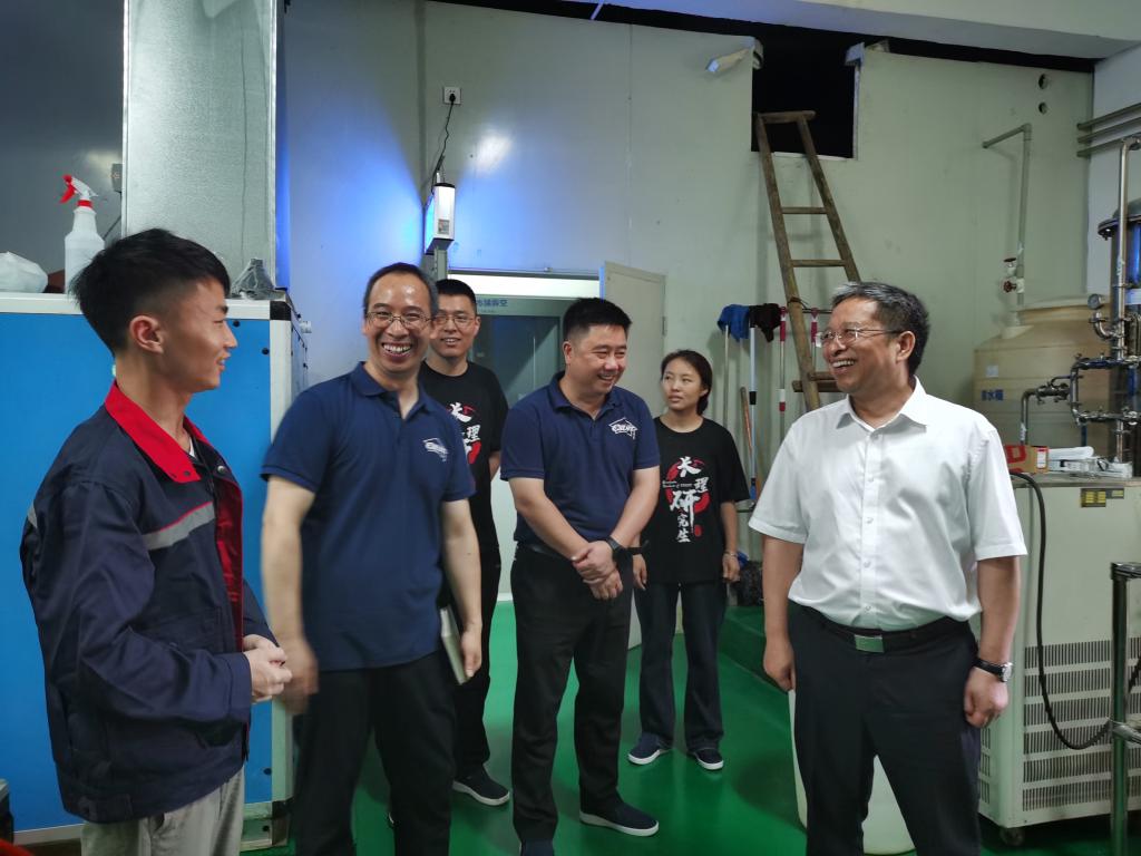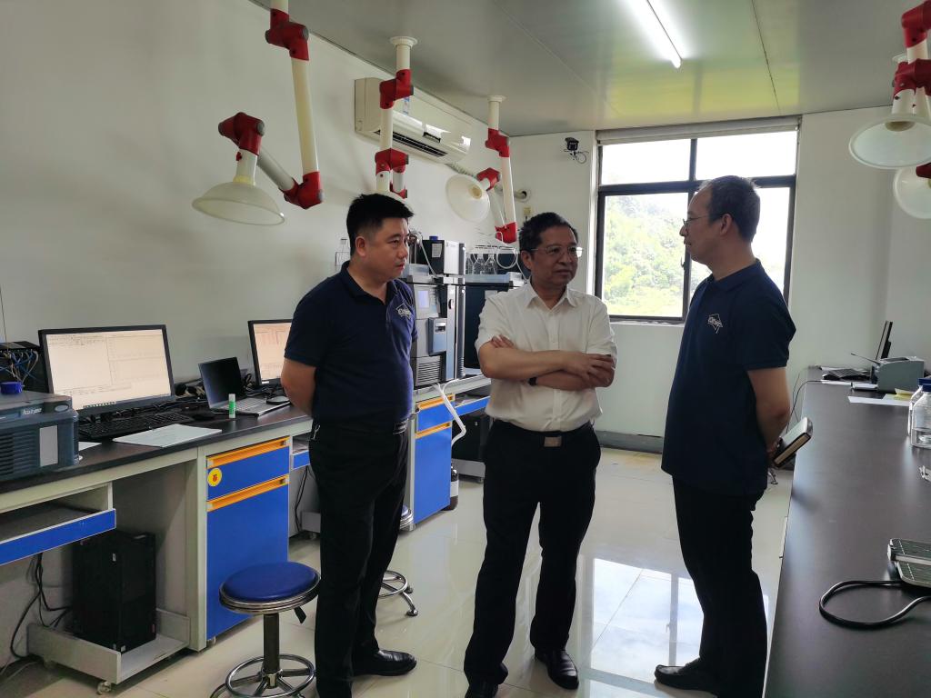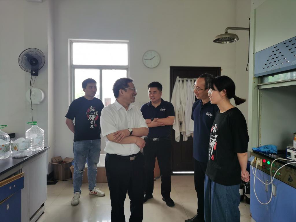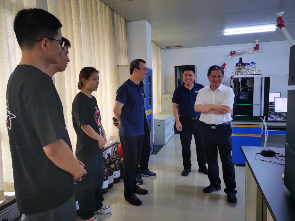 随后,在黄老师和实践团队成员的陪同下,胡永乐一行参观了实践团队工作的实验室、分析室、办公室、中试车间、食堂及宿舍,每到一处,胡永乐都详细了解了师生工作开展和生活保障情况。在中心实验室,胡永乐还与实践团队的同学们深入交流了液相色谱、痕量分析等相关设备或分析方法的相关专业知识。