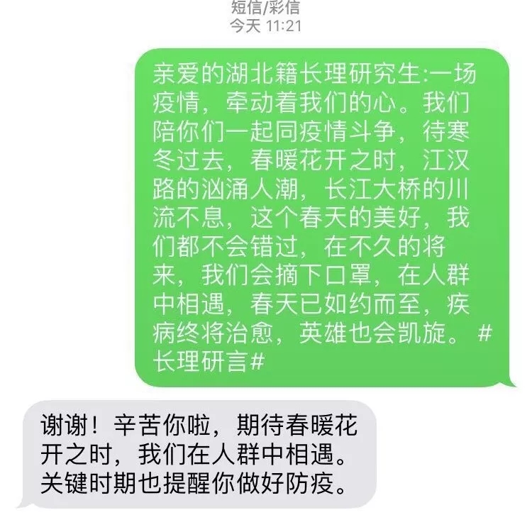 “谢谢,待春暖花开,欢迎来湖北,赏樱花,吃热干面,逛荆州古城,游三峡人家。”威廉体育williamhill湖北籍研究生姚同学回复了一条特殊的短信,而他收到的这条短信是不知名的研究生同学发来的祝福。与此同时,长理247名湖北籍研究生也都在近期收了这样特别慰问短信。