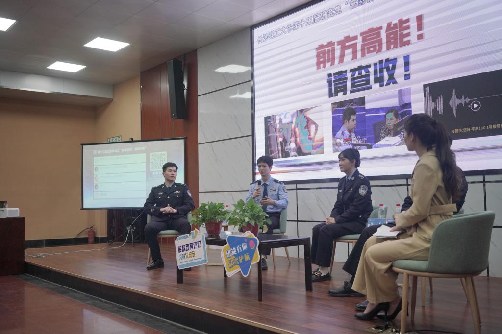 在互动访谈环节,现场观众积极提问,4位警官针对大家的提问给出了具体的建议和提醒。陈慧警官分享了关于“如何更好的处理亲子关系”的真实案例,给现场同学以积极向上的引导,倡导同学们勇敢乐观的面对人生以及树立正确的三观。涂瀚文警官则针对醉酒案例和打架案例,提醒大家珍惜生命,保障自己人身安全。欧阳睿乙警官结合平时处理的交通案件,指出校园电瓶车行车道路注意事项,并提醒同学们在使用电动车时要注意生命安全,财产安全和用电安全。齐翔宇警官结合毕业后的规划问题告诫同学们要早日规划好自己的方向,坚持梦想。现场观众反响热烈,呼声很高。