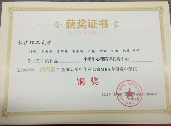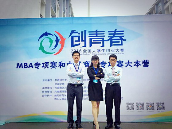 8月28日-30日,由共青团中央、教育部、人力资源和社会保障部、中国科协、全国学联、四川省人民政府共同主办,共青团四川省委、绵阳市人民政府承办的2016年“创青春”全国大学生创业大赛MBA专项赛在四川省绵阳市举行终审决赛。经管学院扶缚龙博士指导,MBA学员刘琦、严艳,本科生曹阳东、尹湘等共同完成的创业项目“小蜗牛心理陪伴托育中心”获得全国铜奖。