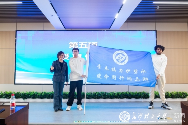 湖南省水利厅团委书记为“大禹之子”青年志愿者协会志愿者代表授旗。在飘扬的旗帜下,志愿者们齐声宣誓:“以青春之名护生命之源,珍惜每一滴水,践行节水理念,守护江河湖海,勇担治水之责,传播绿色文明,共筑生态家园。从此刻做起,以行动为证,努力锻造守护好一江碧水的独特力量!”