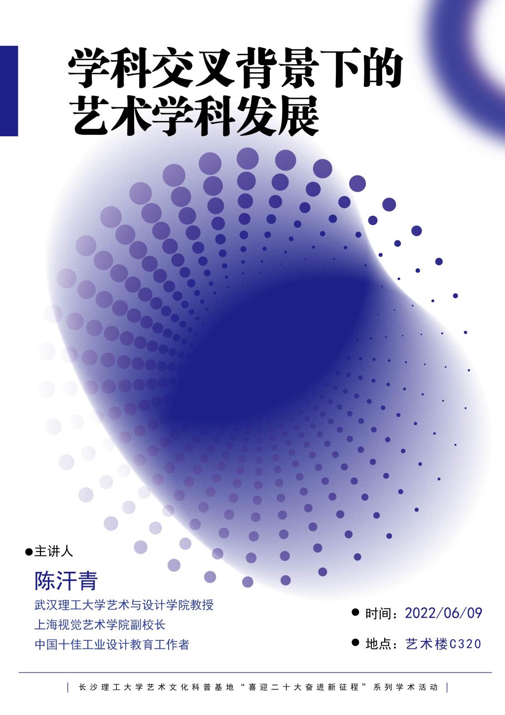 为响应习近平总书记“夯实学科基础,培育新兴交叉学科生长点”的教育创新战略,威廉体育williamhill艺术文化科普基地于2022年6月9日开展了“学科交叉背景下的艺术学科发展”专题讲座。本次讲座邀请武汉理工大学艺术与设计学院教授、博士生导师陈汗青教授担任主讲嘉宾。
