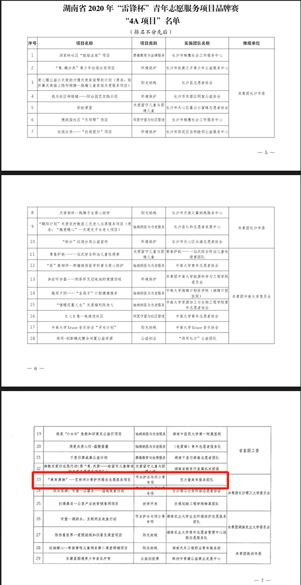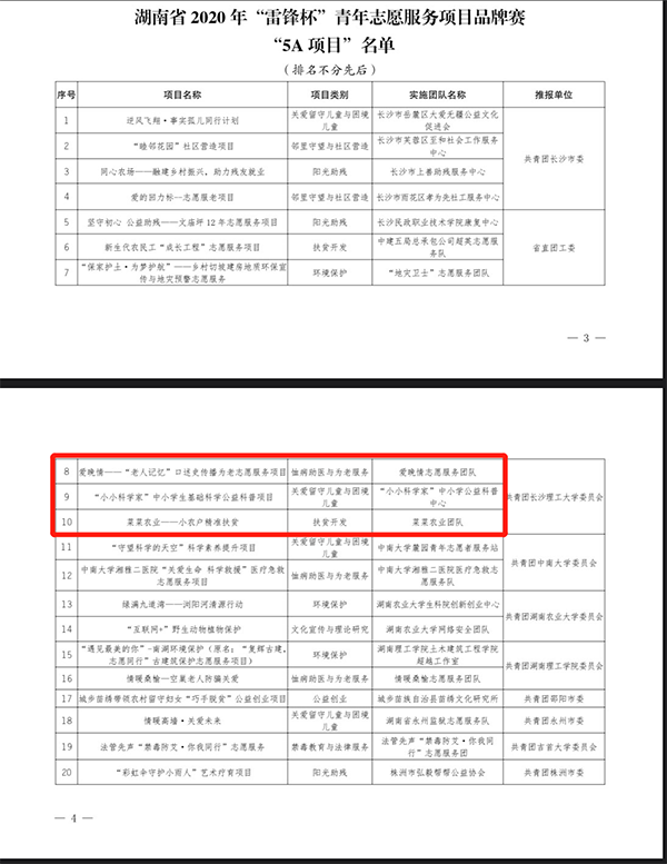 本次大赛旨在贯彻落实习近平新时代中国特色社会主义思想和党的十九大精神,培育和引导广大青年学生了解国情、增长才干、锤炼品格、践行社会主义核心价值观。由刘麟君、谢琪老师指导的樊明焱学生团队项目《爱晚情—“老人记忆”口述史传播为老志愿服务项目》以及由王清、叶洋滈老师指导的刘圣文、马威学生团队项目《菜菜农业—小农户精准扶贫》被授予“5A”项目称号;由李慧老师指导的钟慧玲学生团队项目《“美育潇湘”—艺传河小青护河理念志愿服务项目》被授予“4A”项目称号。