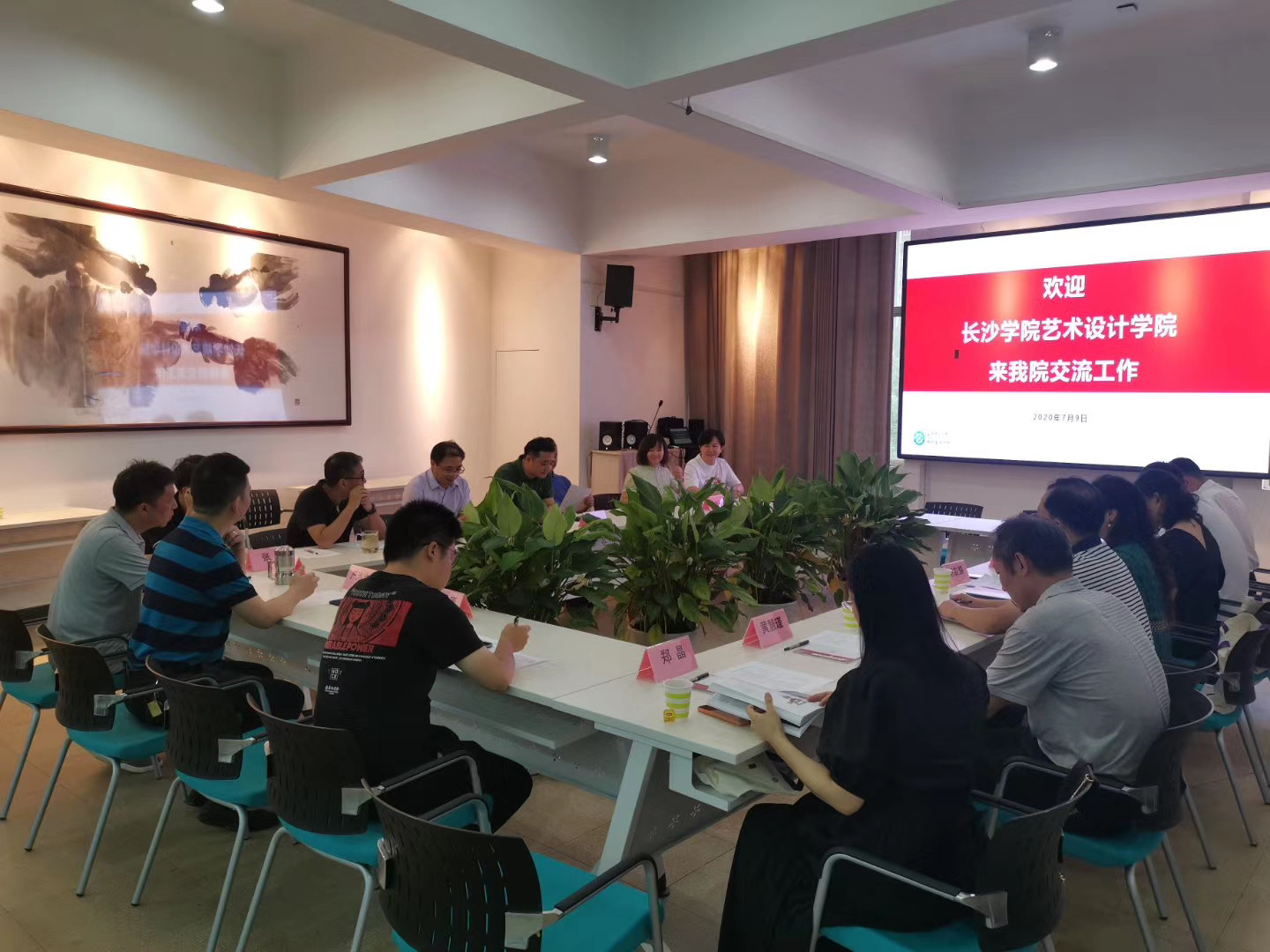 7月9日下午,长沙学院艺术设计学院一行来我院交流学习,会议由院长王健主持,学院党政班子成员、数字媒体艺术系主任朱诗源参加会议。