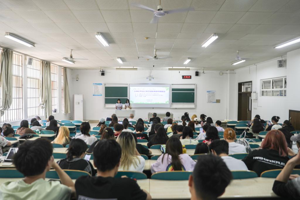 活动现场,来自工美2201-4班、环艺2201-2班、艺管2201班的五个学生小组通过展示PPT,分别围绕环境艺术作品创作、变废为宝、土地环境整治、环保时代的政治使命等方面进行了精彩的演讲。有同学展示了小组制作的环境保护海报,呼吁大家都积极参与到生态环境保护的公益事业;有同学展示了自己参与学院暑期三下乡,利用专业装点美丽乡村的志愿服务故事;还有同学则提到团队正在进行的改造废旧牛仔裤的环保行动。