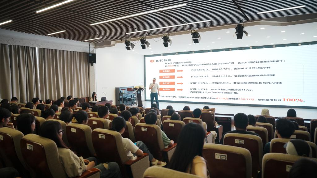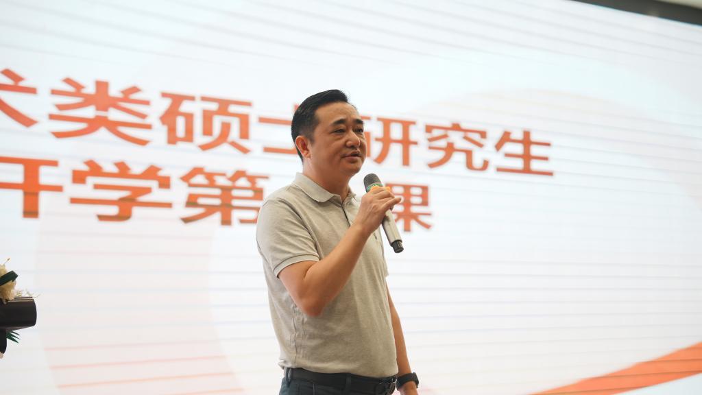 首先,王健院长深入剖析时代背景,强调在风云变幻的当下,研究生需紧跟时代步伐,与时俱进,脚踏实地积累知识经验,沉淀智慧力量。接着,王院长从“研究生学业规划、学术型硕士与专业型硕士的培养目标、研究生毕业与学位授予分离实施办法”这三个关键方面循序渐进地展开指导。他以鲜活的事例、幽默的语言,让原本严肃的学术话题变得轻松易懂,现场气氛热烈,2024 级研究生们全神贯注,沉浸其中,收获满满。最后,王院长满怀期望地寄语同学们,要以零为起点,勇敢开启研究生新征程。在新的阶段,放下过往的荣耀与成就,以谦逊之态迎接全新的挑战。
