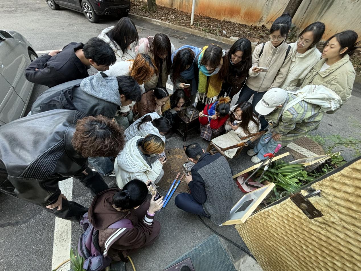 周备自2005年起致力于探索中国传统文化与现代审美之间的融合之道,通过紫铜雕塑这一独特形式,再现并重构了传统文人画意境中的枯木寒亭、小桥流水等元素,赋予作品以悠远意境和雅致之美。同学们展示自己多年积累的创作经验,亲自讲解从设计构思到成品完成的一系列复杂工序他强调,裁剪、雕刻、錾刻、锤锻、熔焊热着色等等,每一件艺术品都是手工精心打造而成,需要极高的耐心和细致入微操作。周备老师对艺术的执着追求对传统技艺的热爱深深感染每一位同学,激发了同学们对于手工艺背后深厚文化价值的认识。