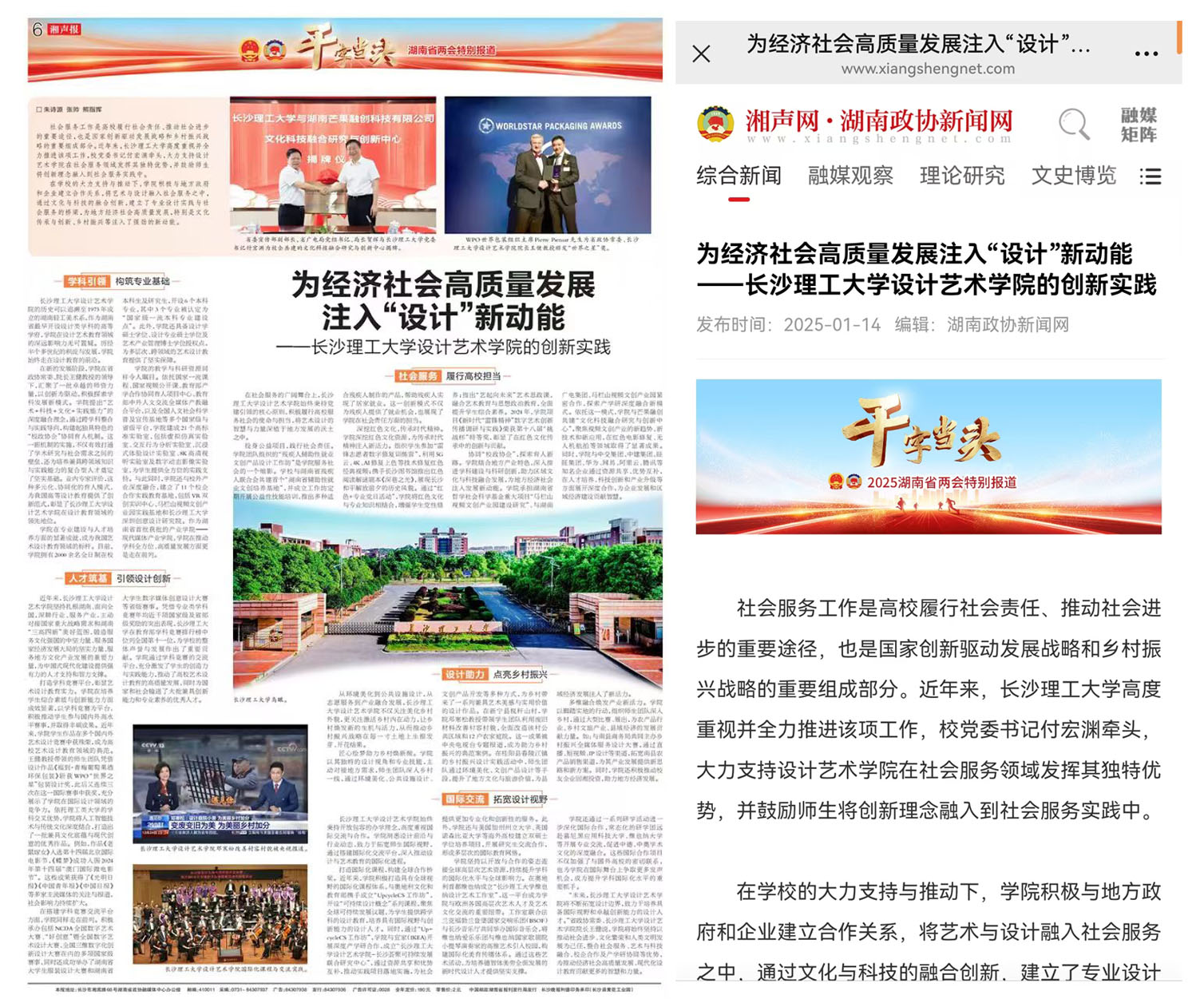 与此同时,湘声报整版特刊从“学科引领构筑专业基础”、“人才筑基引领设计创新”、“社会服务履行高校担当”、“设计助力点亮乡村振兴”、“国际交流拓宽设计视野”五个角度全面报道学院社会服务与创新实践事迹。