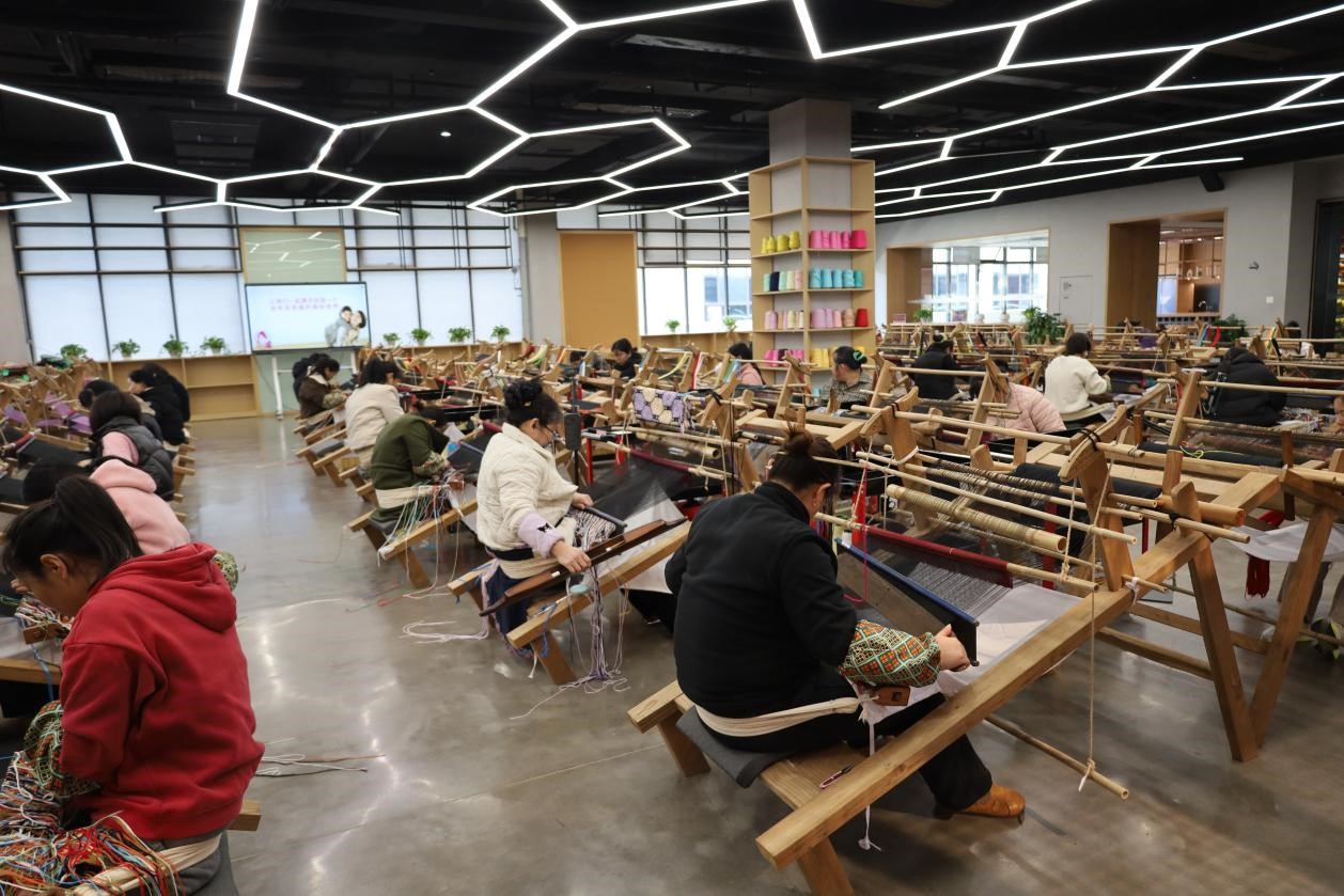 考察团队走进生产车间、非遗展示馆、设计研发中心等核心区域,全面系统地了解了公司的组织架构与运营模式。在织造技艺展示区,技术人员现场演绎了土家织锦挑花、纬线起花等传统工艺的精妙流程,从纹样构思、线料甄选到上机织造的每一个环节,都进行了细致拆解与专业讲解,双方围绕着传统纹样的文化寓意、织造工具的改良创新等关键问题,与技术人员展开深度探讨,并亲身参与简易纹样的织造实践,直观感受非遗技艺的匠心魅力与独特韵味。
