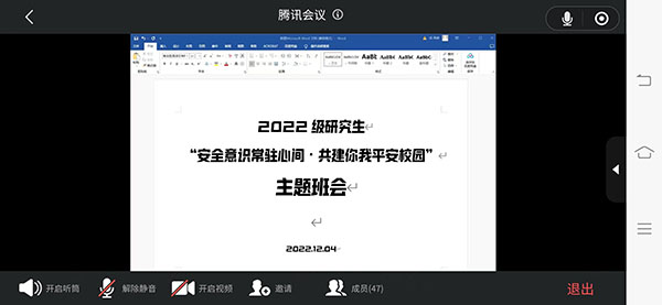 2022年12月1日晚在线上开展了研究生“安全意识常驻心间 共建你我平安校园”主题班会。由研究生辅导员李慧主持本次会议,设计艺术学院全体研究生参会学习。
