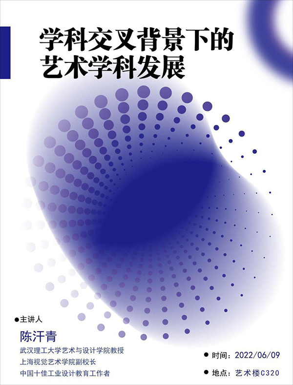 为响应习近平总书记“夯实学科基础,培育新兴交叉学科生长点”的教育创新战略,威廉体育williamhill艺术文化科普基地于2022年6月9日开展了“学科交叉背景下的艺术学科发展”专题讲座。本次讲座邀请武汉理工大学艺术与设计学院教授、博士生导师陈汗青教授担任主讲嘉宾。