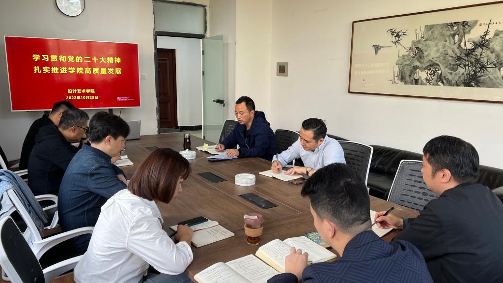 1025日上午,设计艺术学院党委在艺术楼C317会议室持续集中学习讨论习近平总书记在中国共产党第二十次全国代表大会上的报告。本次学习以“学习贯彻党的二十大精神,扎实推进学院高质量发展”为主题,学院党委书记李伟主持并领学了报告,全体党政班子成员参加学习讨论。