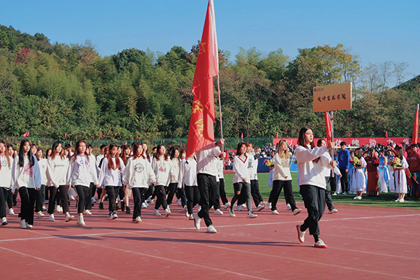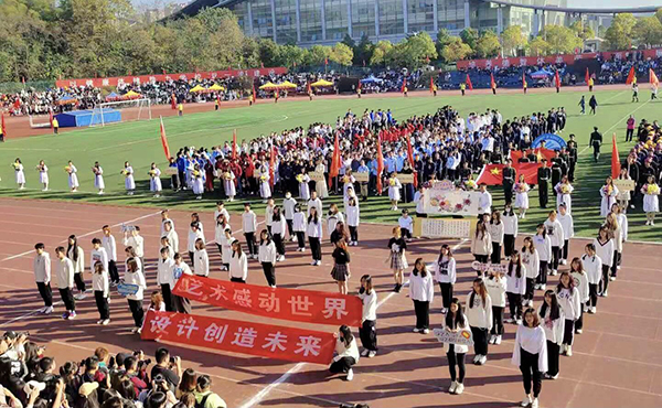 开幕式初,各学院方阵代表昂首阔步在主席台前依次走来。随后各方阵以整齐的步伐展现各学院的特色与风采,在热情的欢呼声中,设计艺术学院代表方阵踏着激昂的乐曲走过运动场半程,接进以三人舞蹈的形式,将书与画在队列之中作为衬托,在方阵首列显现“艺术感动世界,设计创造未来”的条幅,以承载着艺术学子对运动会的热情和精神,紧接着伴随庄严的国歌奏响,全校师生共同起立,面向国旗全体肃立,最后邹宏如致开幕词,他强调体育与健康的重要联系,以此次运动会为依托助力建成拼搏、友爱、团结的“百强”高校!