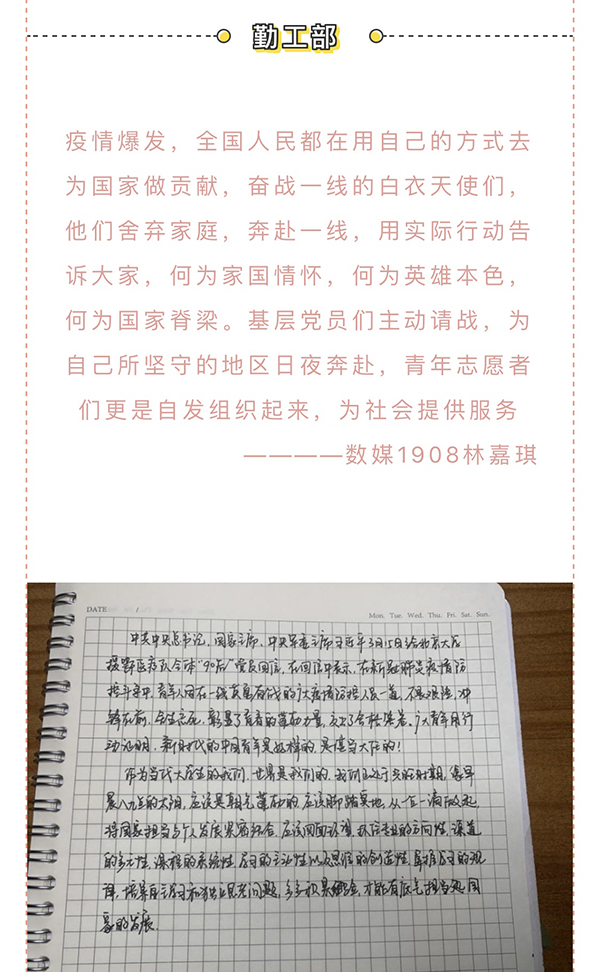 近日,习近平总书记给北京大学援颚医疗队全体“90”后党员回信,向他们和奋斗在疫情防控各条战线上的广大青年致以诚挚的问候。艺术学子对此感受颇深,愿将心中的情感通过纸笔抒发出来。在阅读中国青年参加抗疫的相关推送和文章后,纷纷拿起纸笔写下自己的感悟,每一份手写感悟,字里行间流露出艺术学子的真情实感。更是有许多学生成员自发进行抗击疫情的志愿活动,带起红袖章,化身抗疫前线的战士,守卫自己社区的那一份平安。每一篇感悟的字里行间,每一张照片都撼动着人们的心灵。