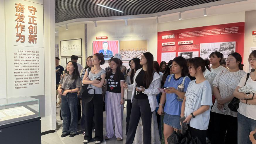 基地以“立德树人,逐梦报国”为主题,展陈面积达1900多平方米,通过2000余幅(件)照片、实物、模型等,系统呈现高等教育发展历程、“三全育人”湖南共识在长理的实践探索及大思政课实践教学创新阵地建设。在李慧老师的讲解下,同学们循着“国之大者”“材之茂者”“师之贤者”“行之实者”四大篇章,从红色地标记忆到奋斗密码,直观感受学校与时代同频共振的发展脉络,在沉浸式体验中深化校情认知、筑牢理想根基。