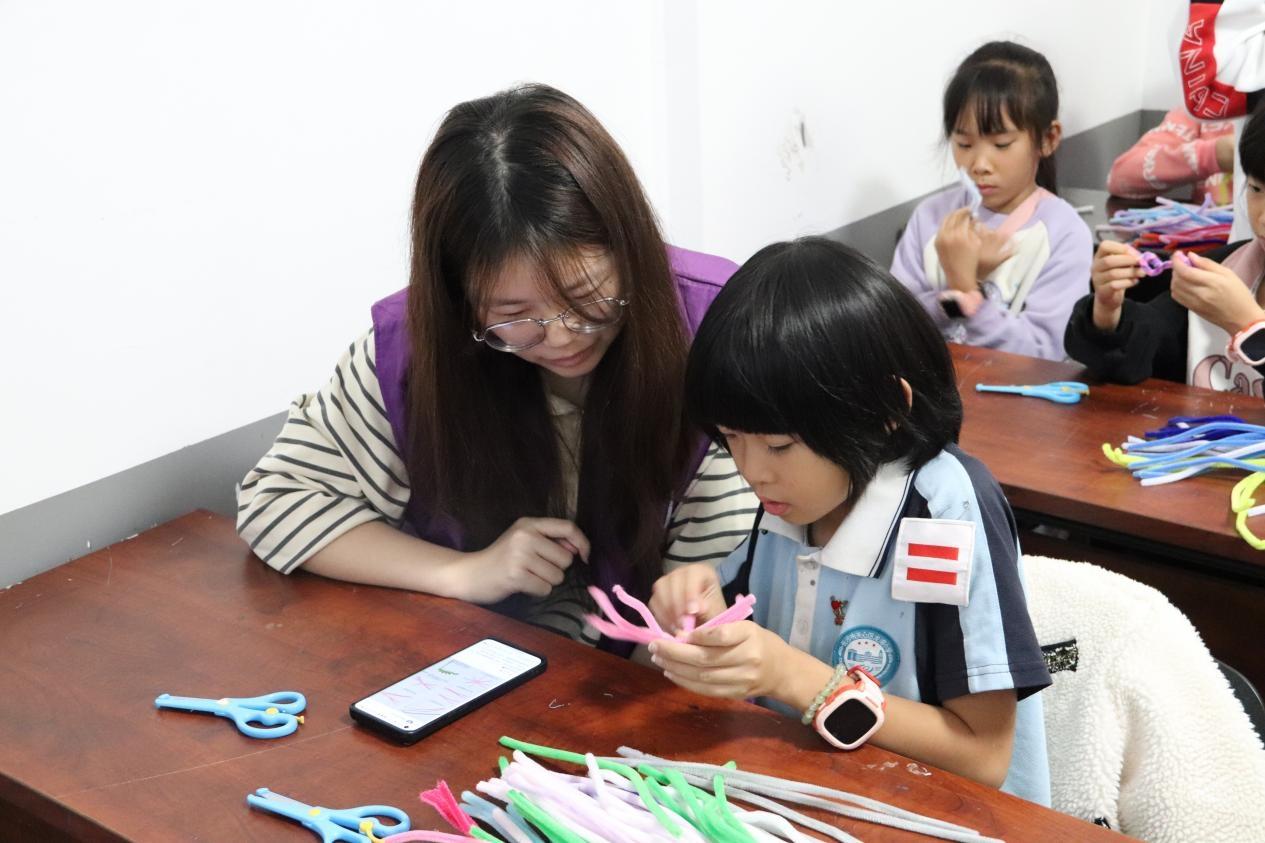 活动中,志愿者通过PPT讲解介绍扭扭棒的创作技巧与应用,引导孩子们发挥想象力进行手工制作。孩子们在实践过程中逐步掌握技能,并在协作中体会到创造乐趣。