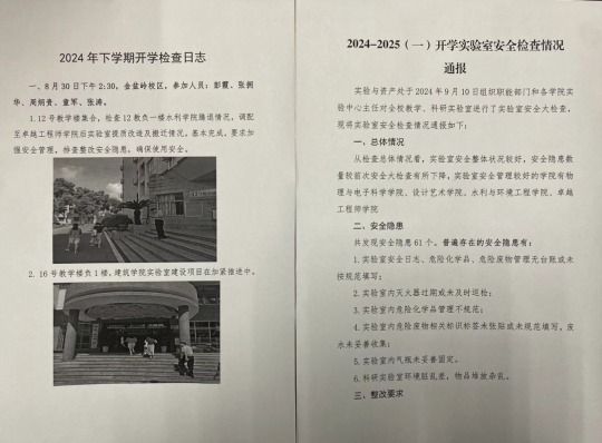 开学以来,我处多次组织实验室安全检查和房屋使用情况检查。检查组重点检查了实验室的消防设施、化学品存储、电气线路等关键环节;结合两校区功能定位,优化房屋布局,发现安全隐患。每次检查均形成检查日志,记录检查过程、检查结果和处理情况,让工作可追溯、可复盘。