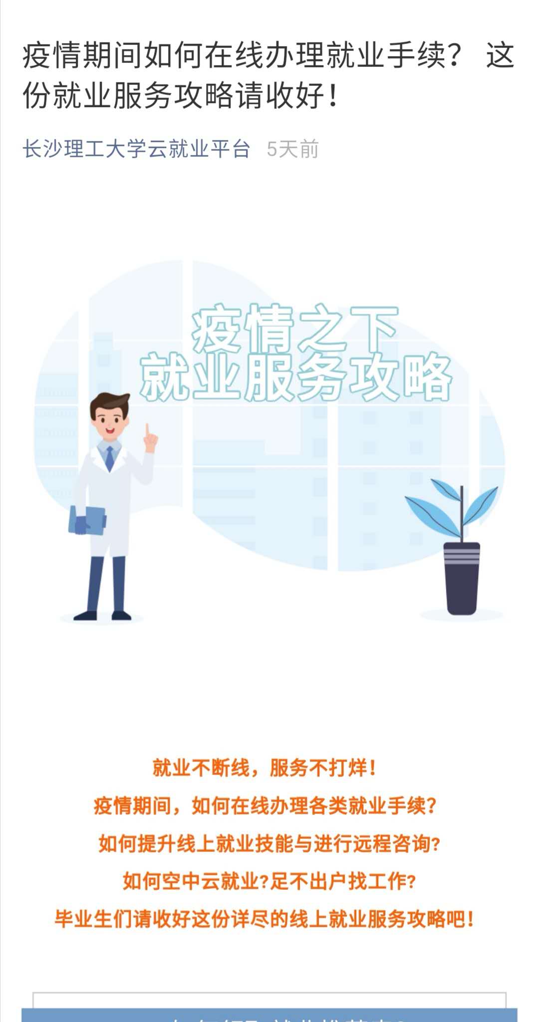 疫情期间学校就业服务由线下转为线上,打破空间的限制,工作内容更加“全方位”。学校从2月初安排轮班,将招就处老师手机号码公布于就业信息平台,及时解答用人单位与毕业生的各类疑问。实行“互联网+”就业服务,简化、优化毕业生网上就业服务大厅手续办理流程,实现毕业生就业数据“一网统管”、就业服务“一网通办”、校内就业手续网上“一站式”办结。推出“疫情之下就业服务攻略”指南,详细说明毕业生如何足不出户“无接触”就业,促进了就业服务的及时精准化,缓解了特殊时期毕业生就业难和企业招聘难的“两难矛盾”。