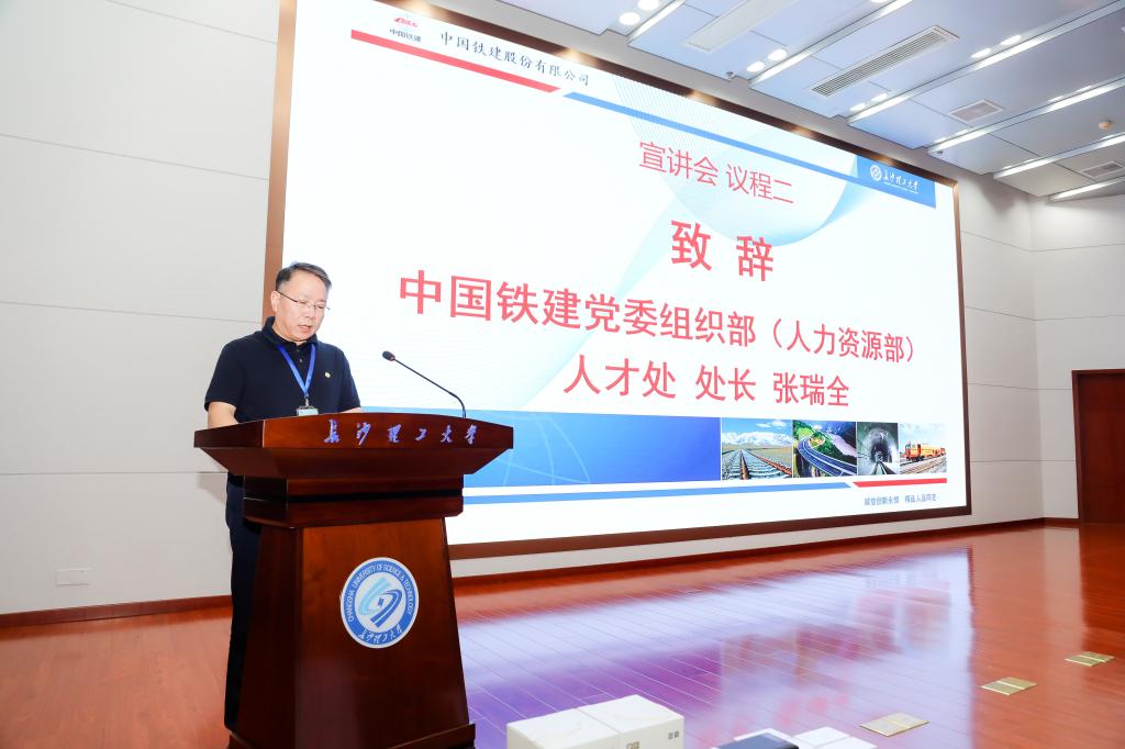 张瑞全代表中国铁建致辞。他对学校长期以来给予中国铁建的大力支持表示感谢,对扎根铁建的长理校友给予充分肯定。他向长理学子发出诚挚邀请,期待更多的长沙理学子加入中国铁建,携手奋进在新时代,共筑中国铁建新的辉煌,为国家基础设施建设事业做出更大的贡献。