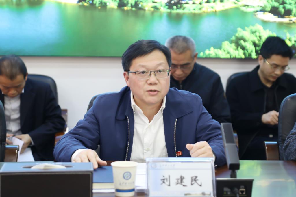 汇报会在在一办六楼会议室召开,学校校长曹一家,校党委副书记刘建民,党委委员方琼出席,相关职能部门和学院主要负责人参加会议,刘建民致欢迎词。