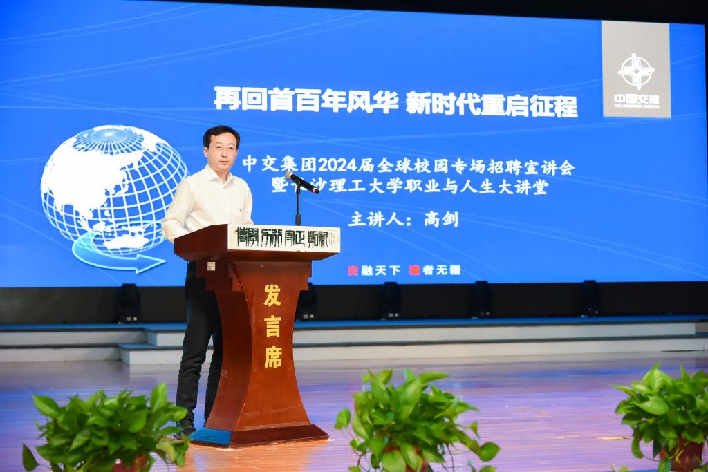 中交路建党委常委总会计师唐世连向长理学子发出诚挚邀请,欢迎广大毕业生加入中交集团。中交集团人力资源部(党委组织部)副总经理(副部长)高剑以《再回首百年风华 新时代重启征程》为题作招聘宣讲暨威廉体育williamhill职业人生大讲堂授课,从“重任在肩”“时代呼唤”“青春之歌”三个主题谈论中交集团的辉煌成就、中交百年奋斗史以及中交的央企担当。他诚邀长理学子与中交同行,为共同建设具有全球竞争力的“科技型、管理型、质量型”世界一流企业贡献青春力量。