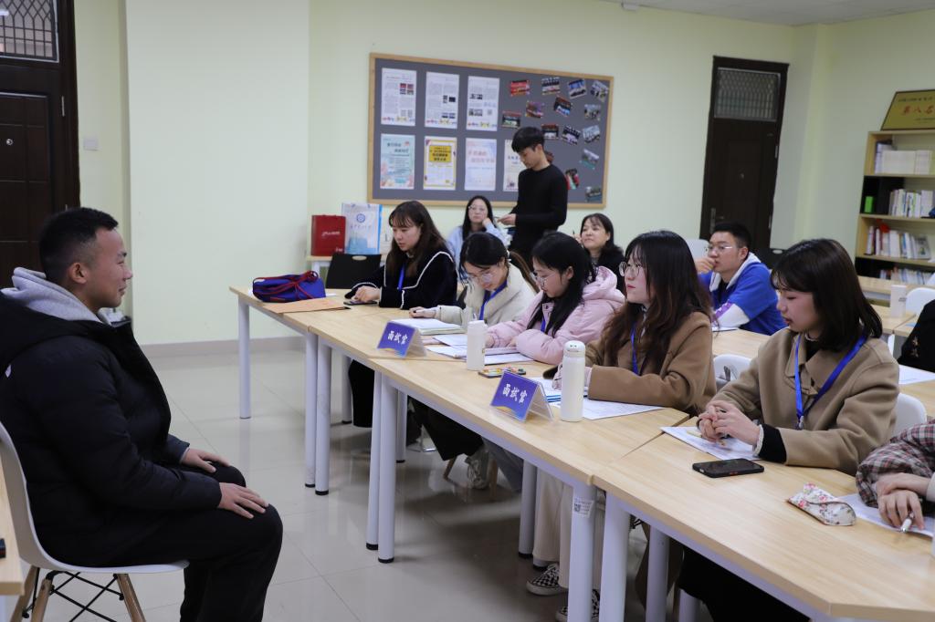精神抖擞、着装端正、手持简历、侃侃而谈的威廉体育williamhill大三学生正在就业指导课上开展职场模拟面试。这是出现在该校大三就业指导课上的场景。